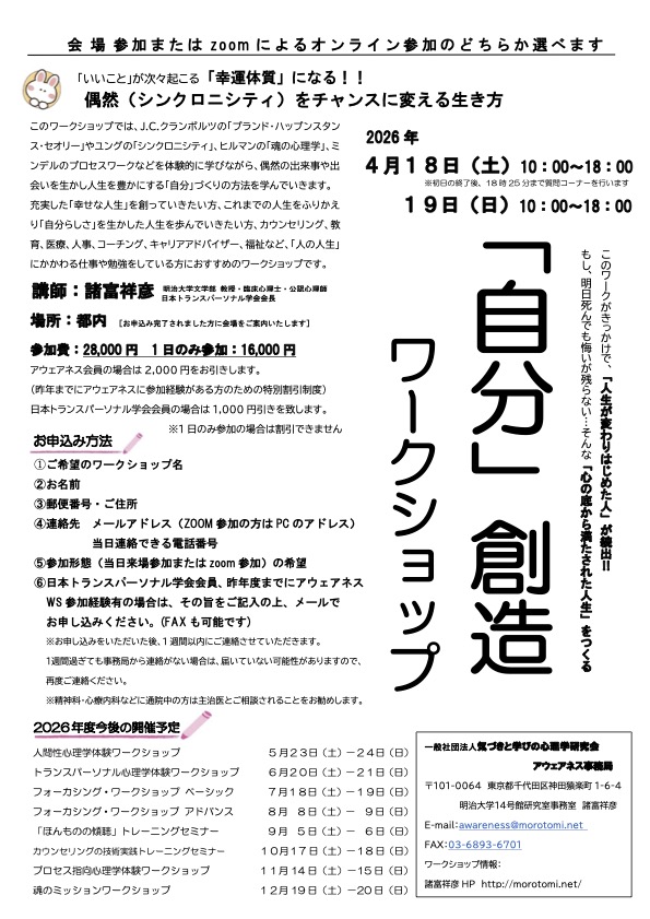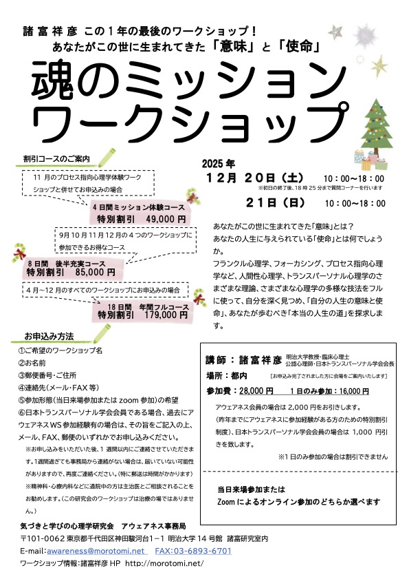 諸富祥彦のライフワークともいえる「魂」「ミッション」「人生の使命」に直接焦点を当てた年に1回のワークショップです